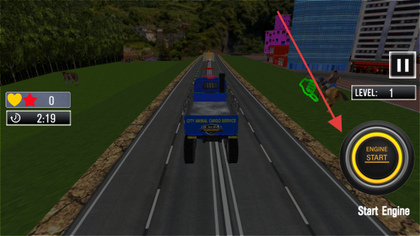 3、在公路场景,点【ENGINE START】启动卡车,按关卡要求,运输马匹,避开障碍,完成任务。