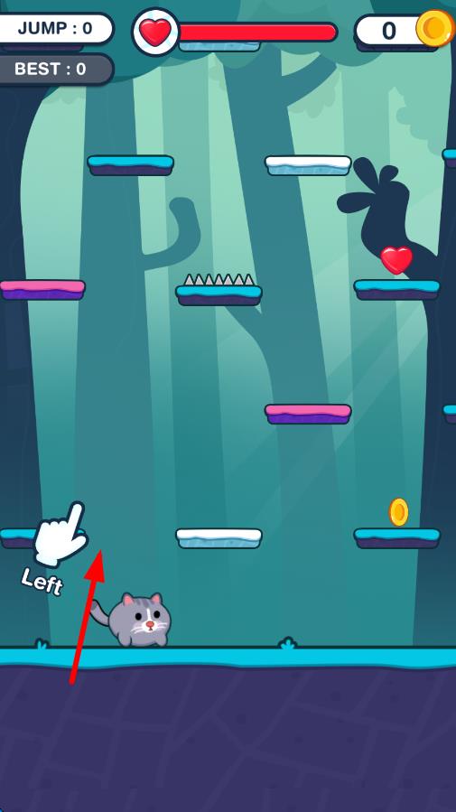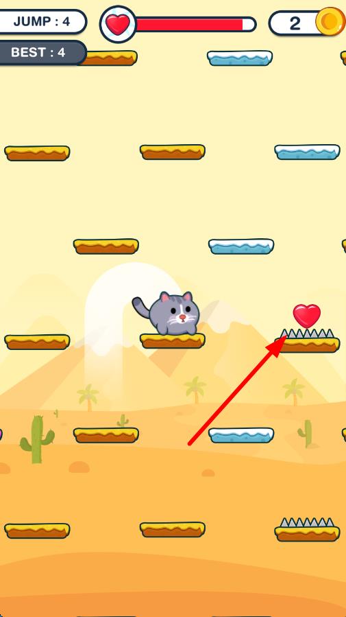 1、进入关卡后,点击屏幕控制角色向上跳跃,利用弹跳板提升高度,避开带有地刺的危险平台,注意仅剩3条生命值。