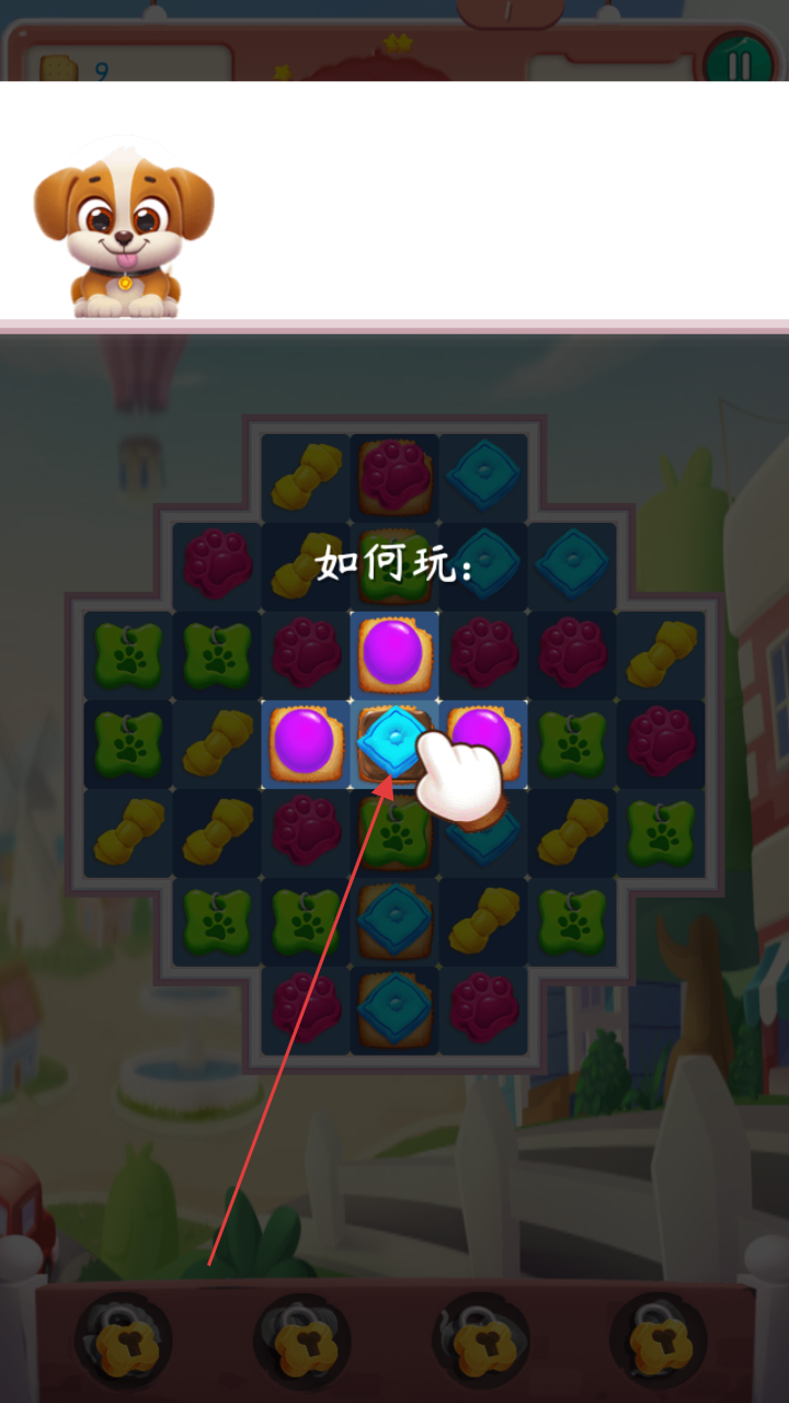 1、进入关卡,点击相邻的两个元素(如骨头、爪印图标)交换位置。