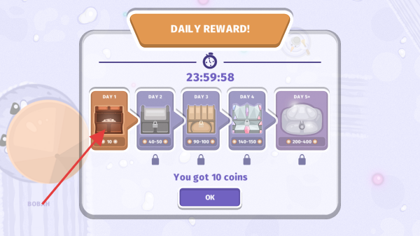 1、每日登录领【DAILY REWARD】,点DAY1宝箱得10金币,领完点【OK】,后续天数可解锁更多奖励。