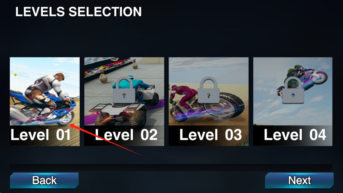 2、选择关卡,注意收集限时零件,可能用于合成稀有摩托车,利用每日登录奖励获取免费升级与加速解锁。