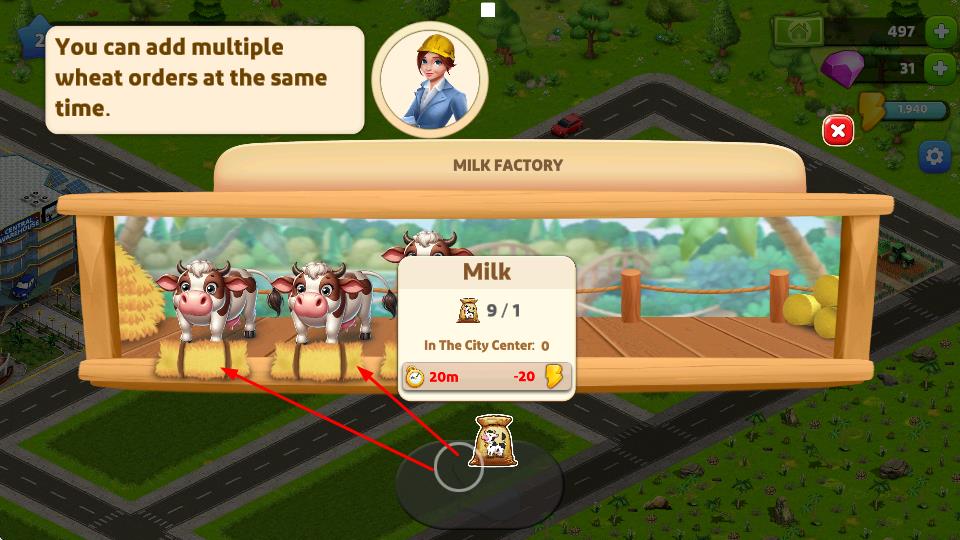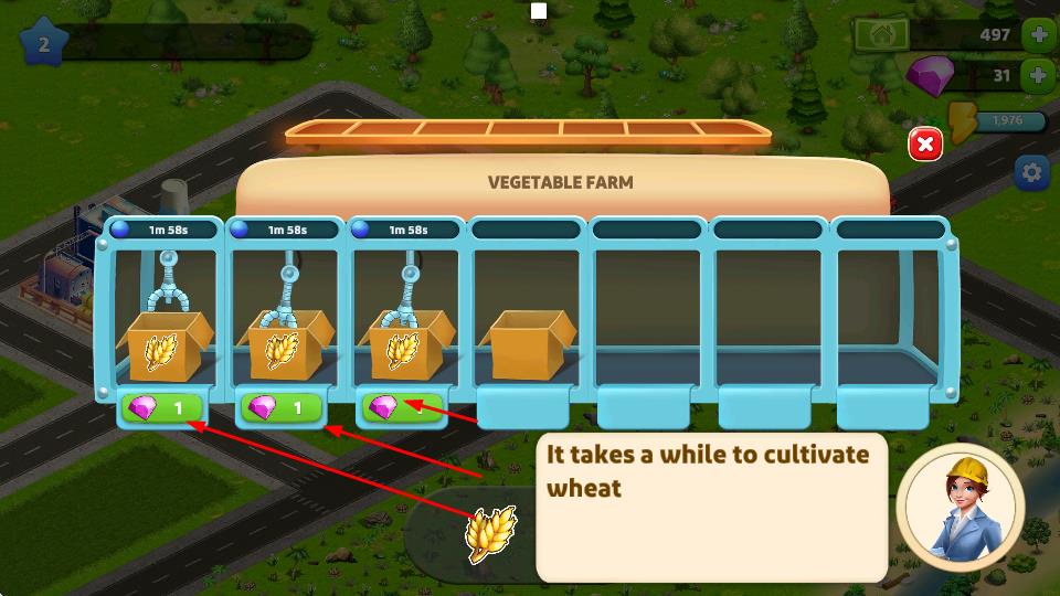 2、在农场,布置生产订单,消耗钻石等资源,等待培育时间,完成后收获作物,满足城市需求。