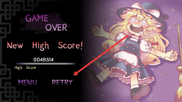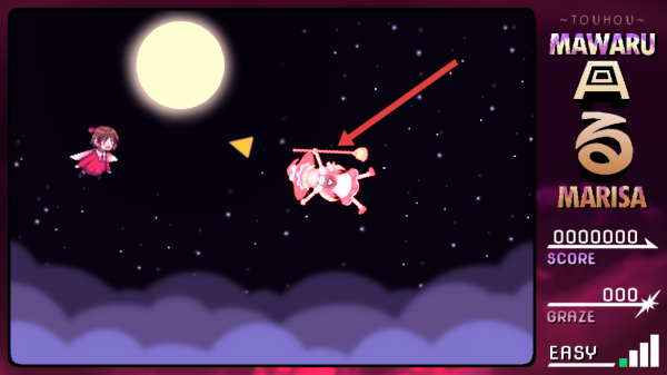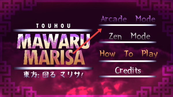 1、在主界面,选择【Arcade-Mode】(街机模式),进入【Touhou-Mawaru-Marisa】,操控魔理沙开始飞行射击。