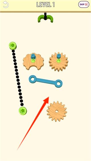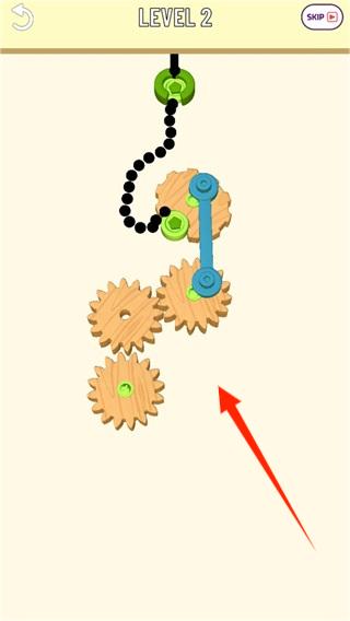 1、关卡1中,拖动零件,连接齿轮、连杆等,让机械结构顺畅运转,完成组装。