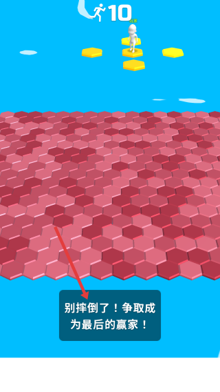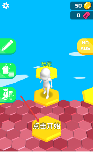 1、点击“点击开始”,操控白色小人,在六边形网格上跳跃,避开掉落区域。