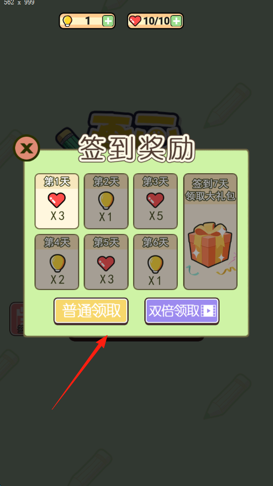 1、进入签到奖励界面,点击普通领取,获取每日签到道具,积累7天领礼包。