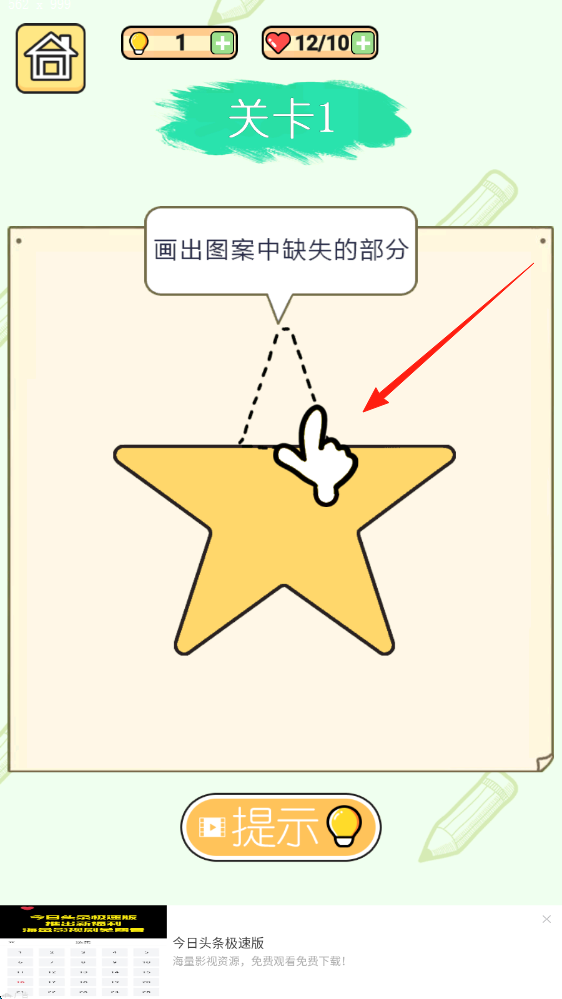 2、关卡1中,观察图案,用手指画出缺失部分,完成图案,通过该关卡。