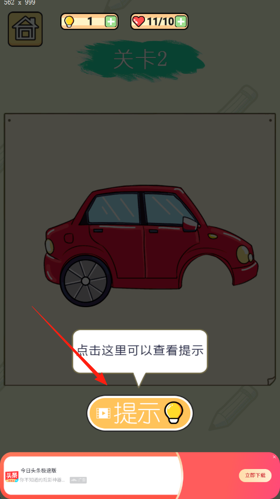 3、关卡2遇到困难,点击提示按钮,观看视频或获取线索,完成汽车补全。