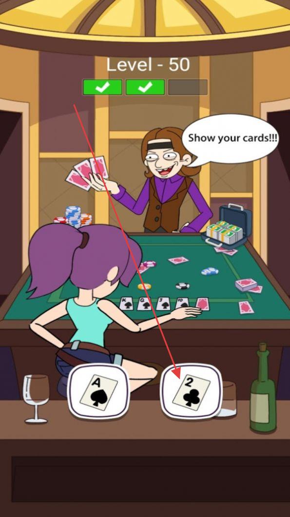 2、面对挑战(坠落洞穴选道具、赌场玩牌局),选择对应操作(点击雨伞/匕首、出牌)。