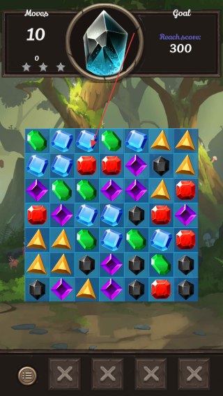 2、在消除棋盘内,滑动相邻的同色宝石(如蓝色、绿色等),使其配对消除,获取分数 。