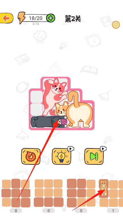 1、打开界面,看着屏幕上待摆放的猫咪图案与空白方格,思考如何安置第一只猫咪,开启趣味拼图之旅。