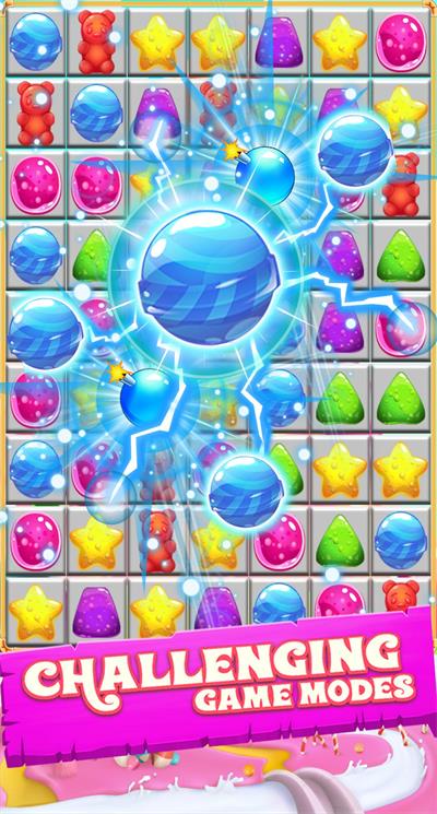 2、画面设计甜美可爱,五彩缤纷的糖果造型萌趣十足,搭配晶莹剔透的特效表现,每次消除都会迸发出令人愉悦的视觉盛宴,营造出欢乐的游戏氛围。