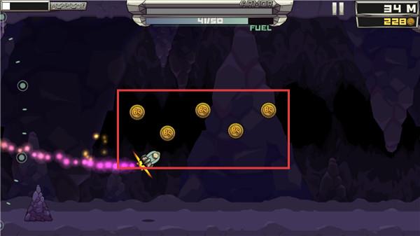 3、宇宙金币收集:在飞行过程中,留意散布在岩洞的宇宙币,灵活操控火箭收集,用积累的宇宙币到商店升级火箭,为后续更艰难的冒险做好准备。