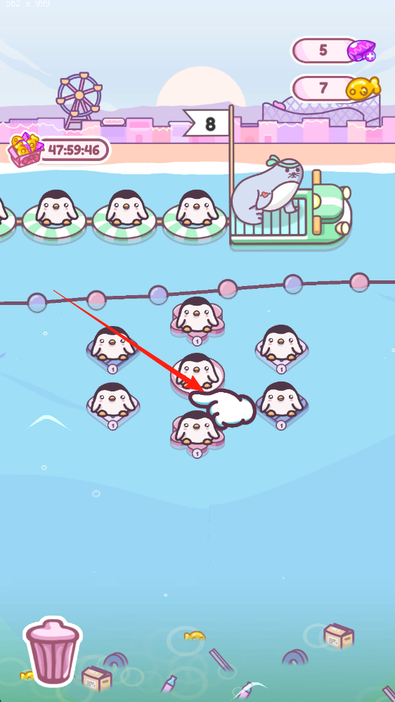 2、合并企鹅,提升等级,安排至对应位置,完成目标,解锁新内容。
