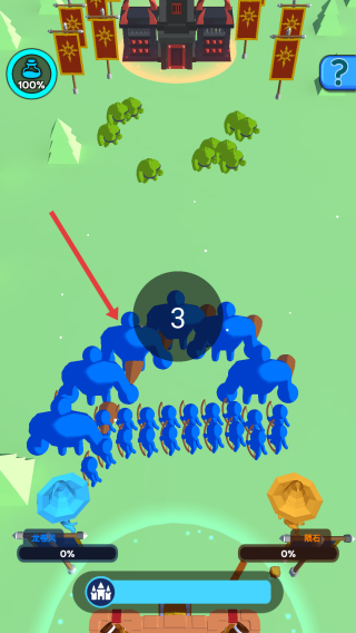 2、弓兵部队集结后,点击部队上方数字(如3),指挥其向敌方城堡推进。