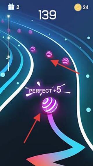 1、节奏躲避技巧:跟随音乐节拍预判障碍出现时机,滑动屏幕灵活操控彩球左右移动,完成精准躲避动作。