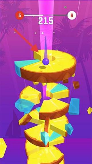 2、让小球落入切片水果的空隙,击碎水果,持续向下推进。