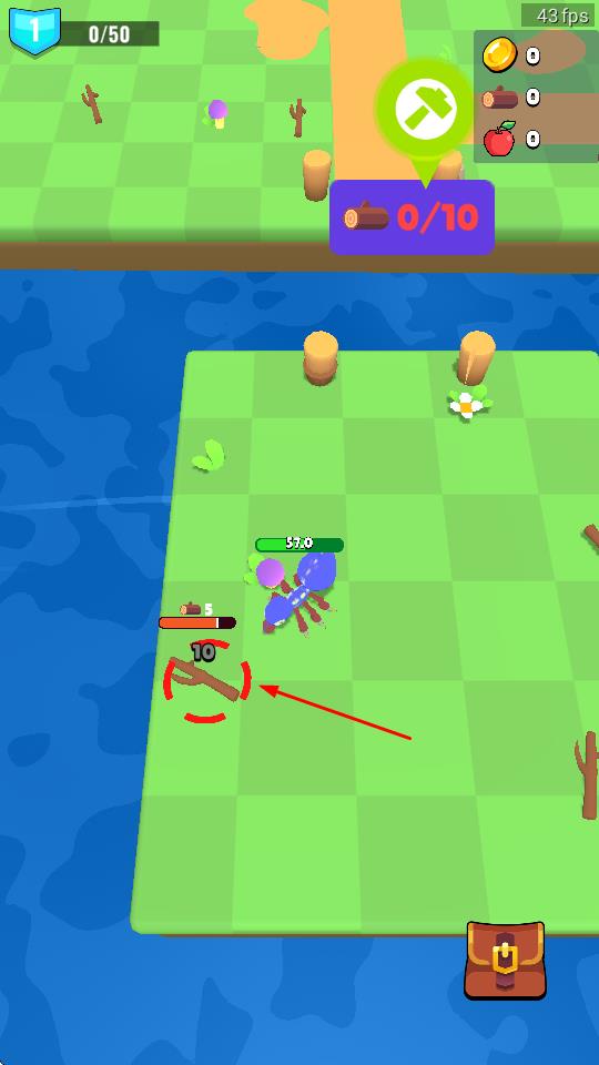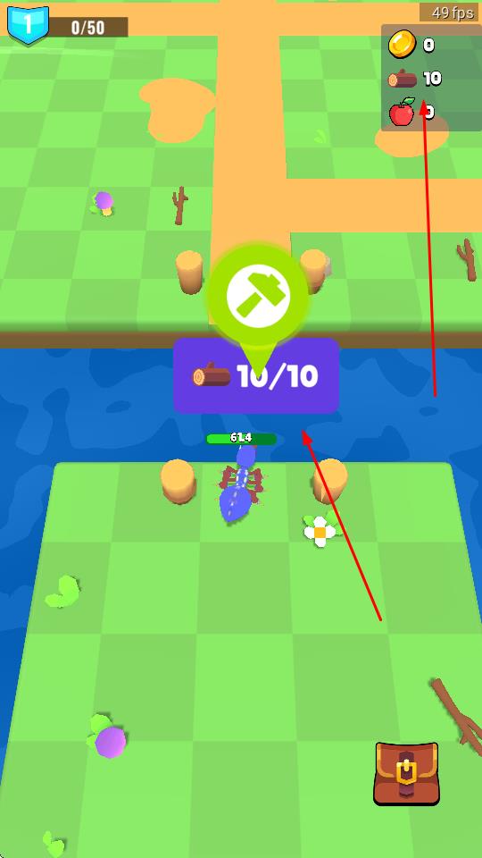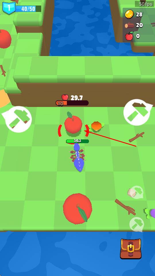 1、操控蓝色生物,靠近树木、苹果等资源,点击工具图标,采集木材、果实,积累生存物资。