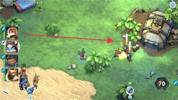 2、训练场景,操控动物角色(左侧展示多个可选动物),向目标建筑移动,进行战斗训练。