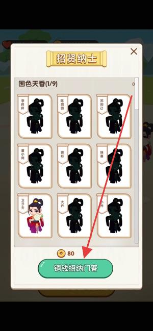 1、进入游戏,有“招贤纳士”等养成模块,消耗铜钱招募门客;核心为成语关卡,如“每日挑战”“第13关”。