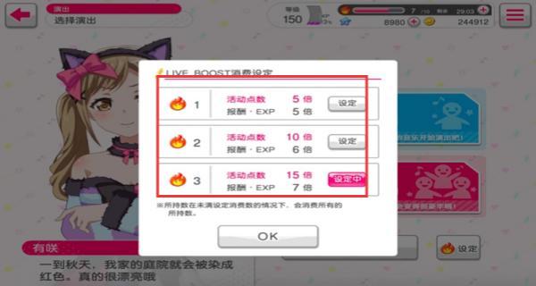 2、每30分钟会积攒一个Liveboost,设置演出的Liveboost消费数量可以变更获得的演出报酬。