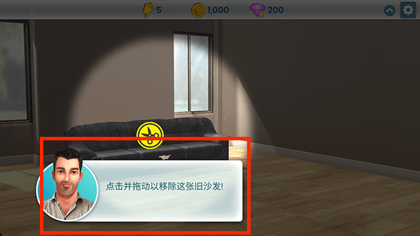 1、进入游戏后,会有一段新手指引,点击剪刀的图标便可以对沙发进行改造。