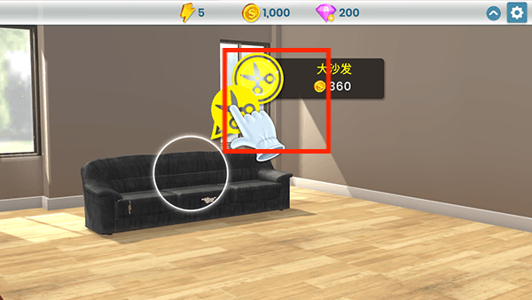 2、改造沙发需要360个金币,将剪刀图标移动到沙发上。