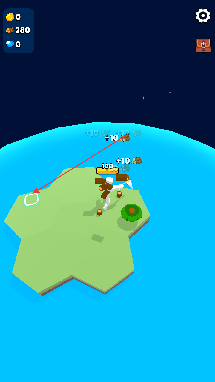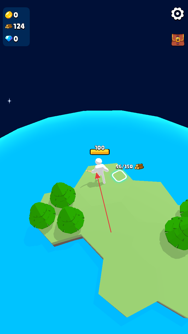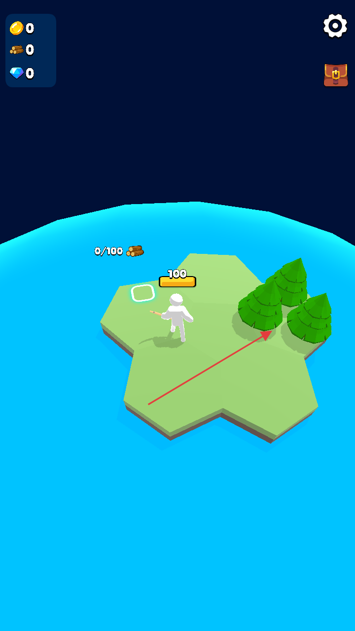 1、进入游戏,操控角色在岛屿场景活动,靠近树木点击交互,砍伐收集木材资源。