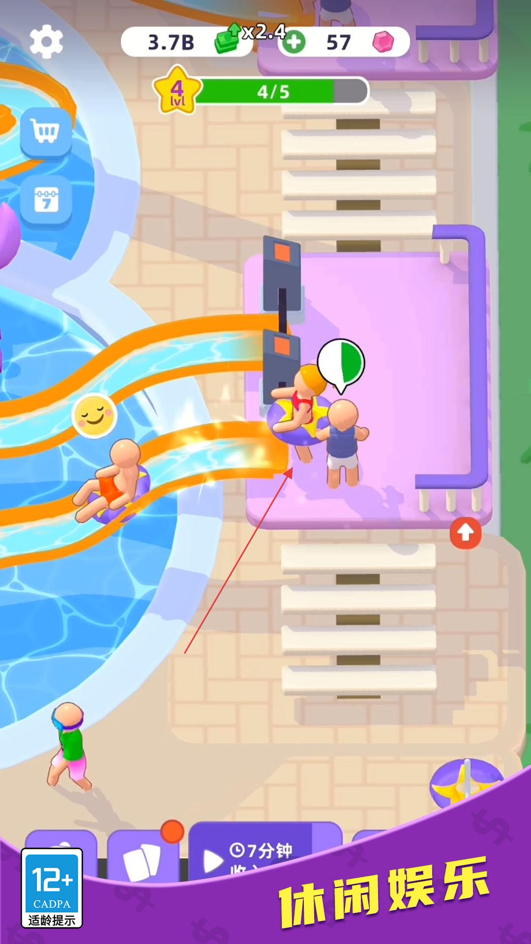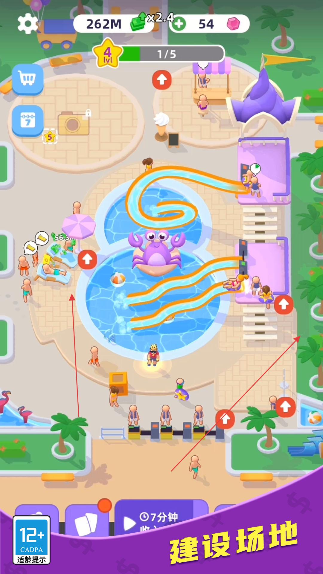 2、在乐园场景,消耗金币、资源升级泳池、滑梯等设施,拓展场地规模,吸引更多游客,提升乐园收益与等级。
