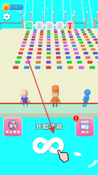 1、游戏初始界面,有“开始游戏”按钮,还有“幸运转盘”“商店”功能,上方显示关卡进度(1-4),可开启游戏。