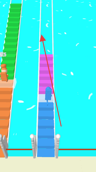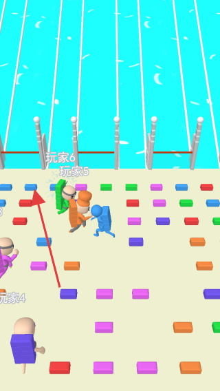 3、游戏赛道场景,玩家(玩家5等)通过收集同色方块搭建跑道,沿跑道向泳池终点前进,完成竞速。