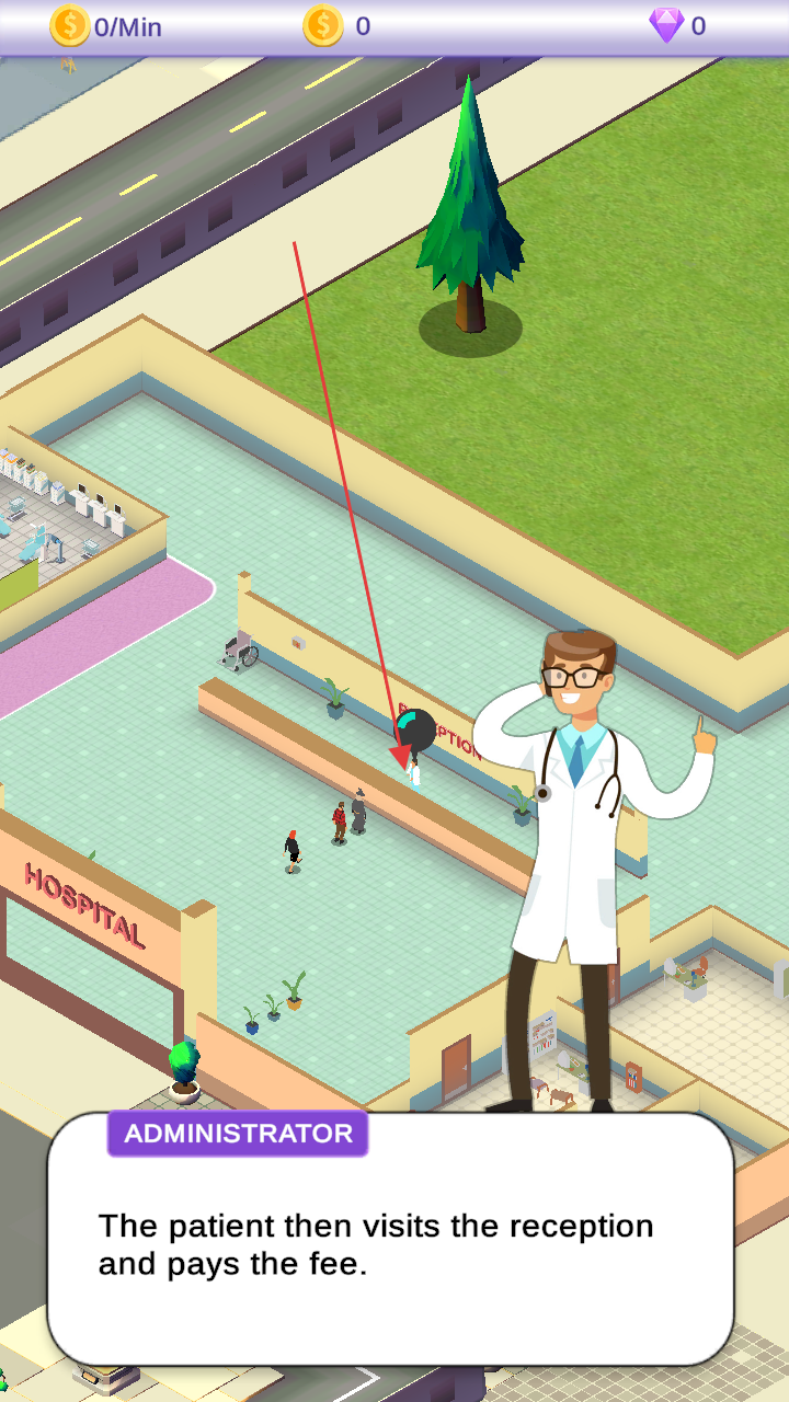 1、进入游戏界面后,引导患者前往接待处,完成缴费操作,这是诊疗流程关键一步,保障流程推进。