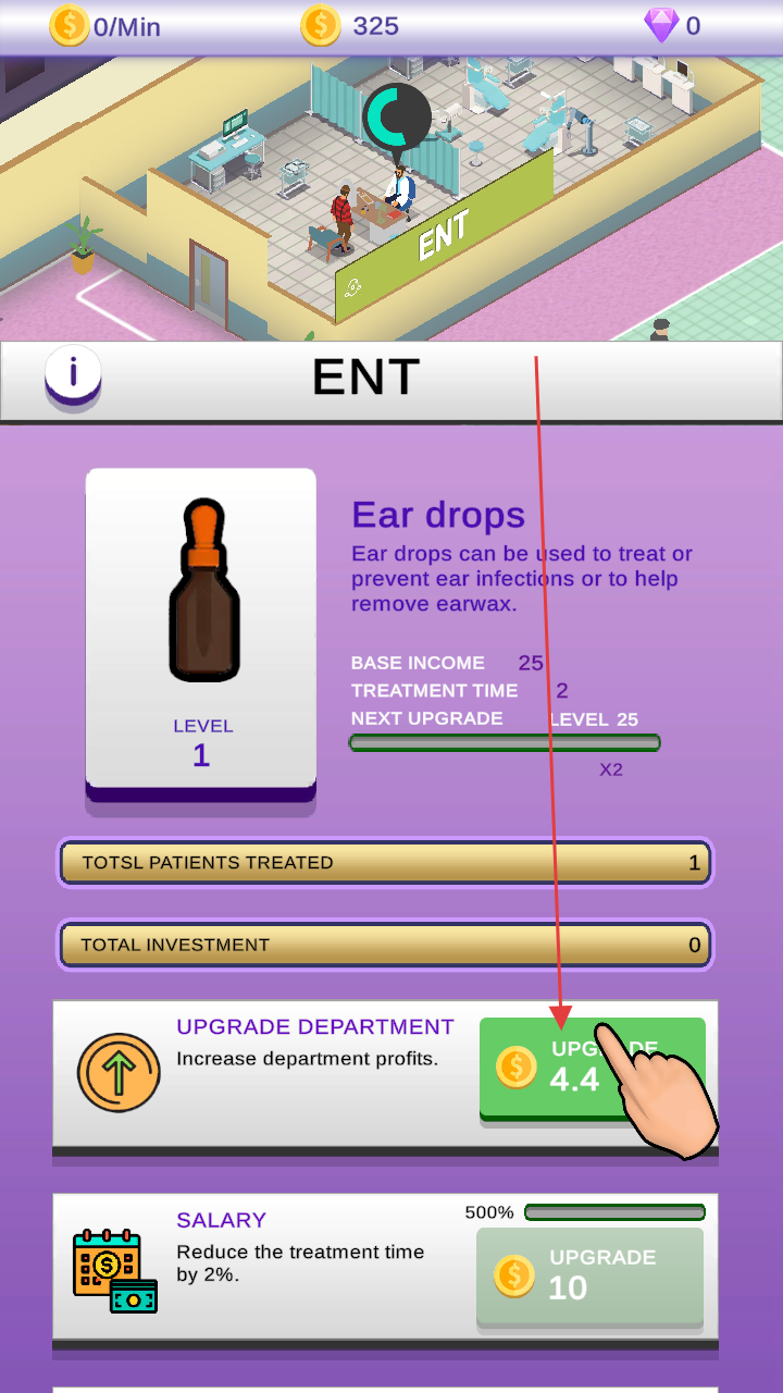 3、在科室界面,消耗金币点击“UPGRADE”升级,提升收益与诊疗效率,合理规划资源,推动医院发展。