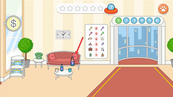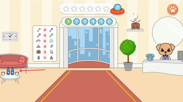 1、场景互动:进入酒店大厅,按指引移动物品(如水瓶),将其归位到对应区域(沙发旁圆桌),完成场景整理。