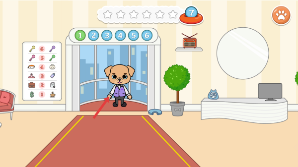 2、任务推进:通过移动、摆放物品,解锁新区域、新角色(穿制服的小狗),推进酒店经营流程。