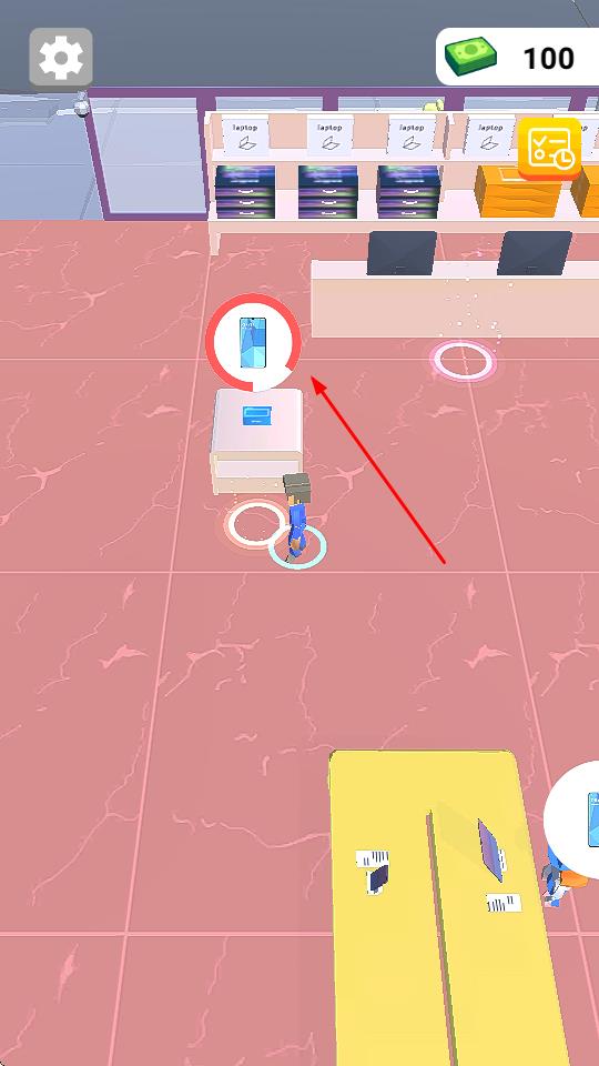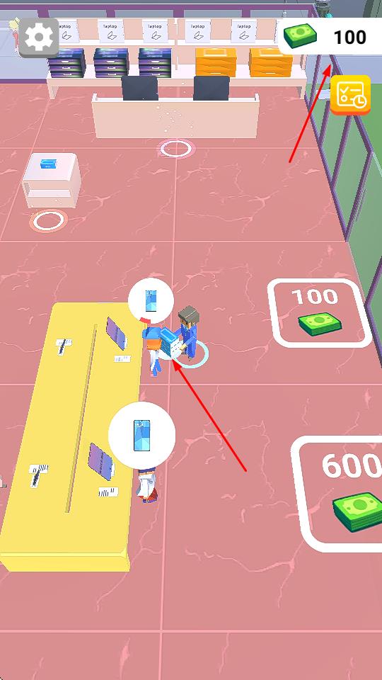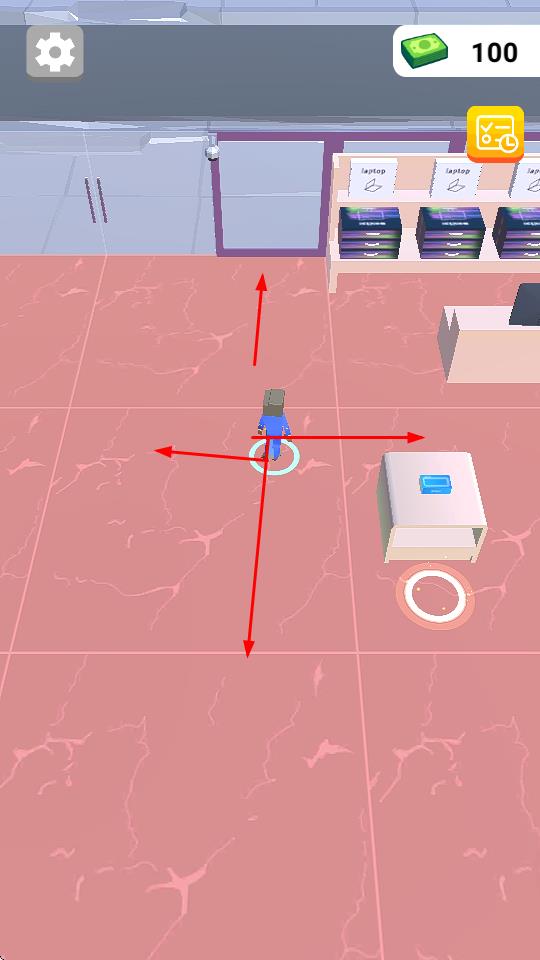 1、操控角色在场景内,按箭头指引自由行走,探索区域,接近商品、顾客等互动点。