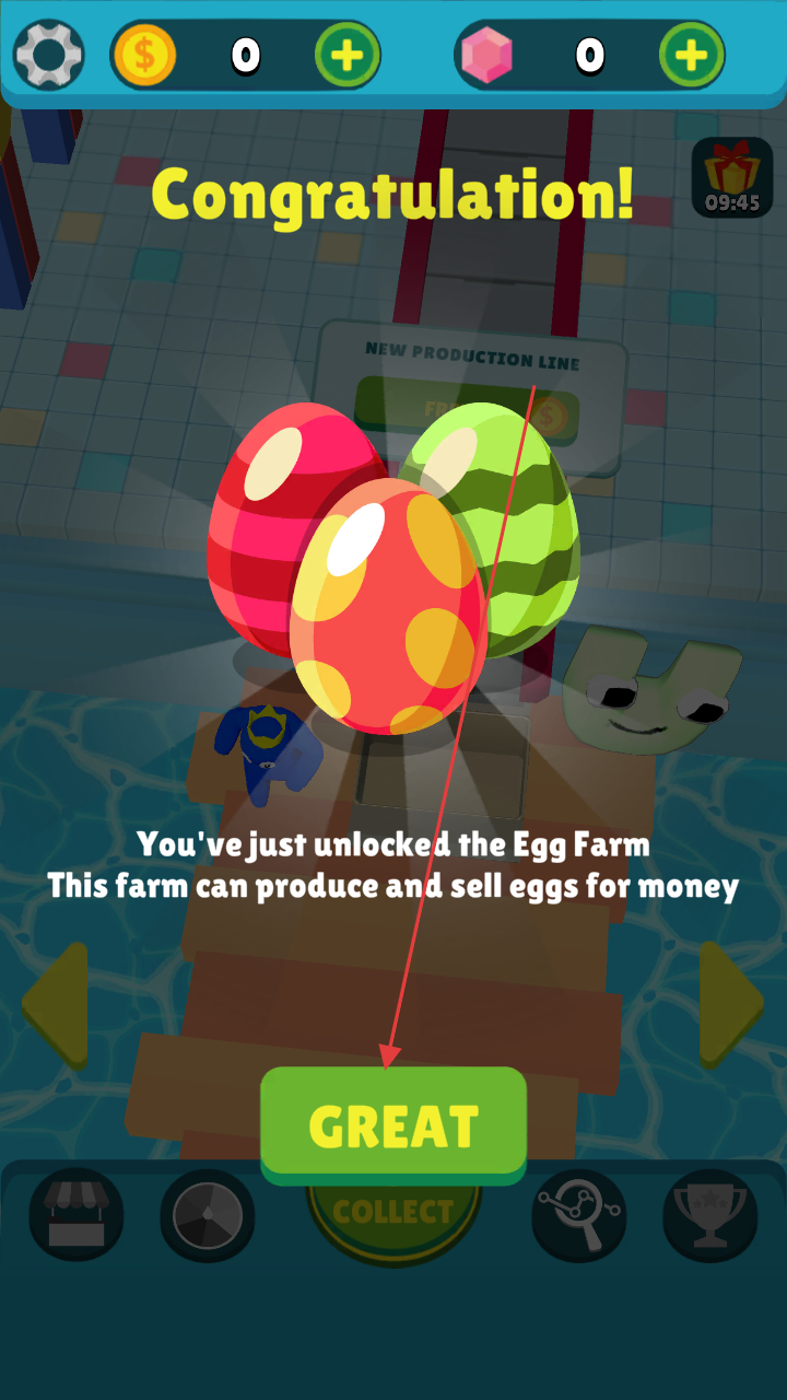 1、点击“GREAT”确认解锁蛋农场,生产、售卖鸡蛋获利,用金币解锁拓展产线。