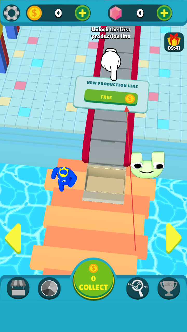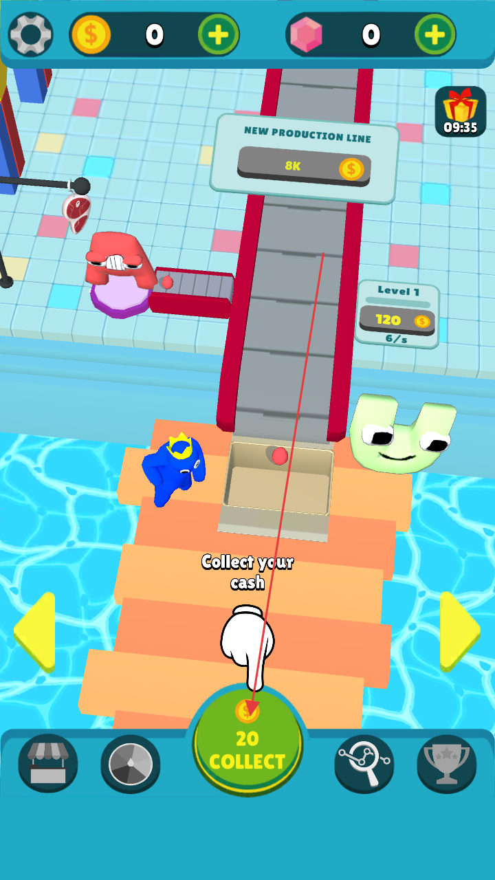 2、按指引操作,点击“COLLECT”收取现金,积累资金升级产线(如消耗8K金币),提升生产效率、解锁新物品。