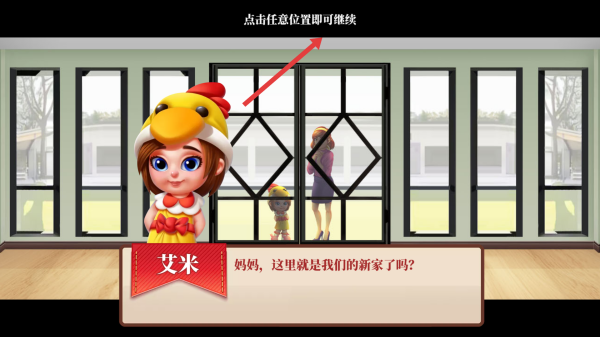 2、剧情推进:通过对话(如艾米询问新家)了解背景,点击任意位置继续,解锁家装场景。
