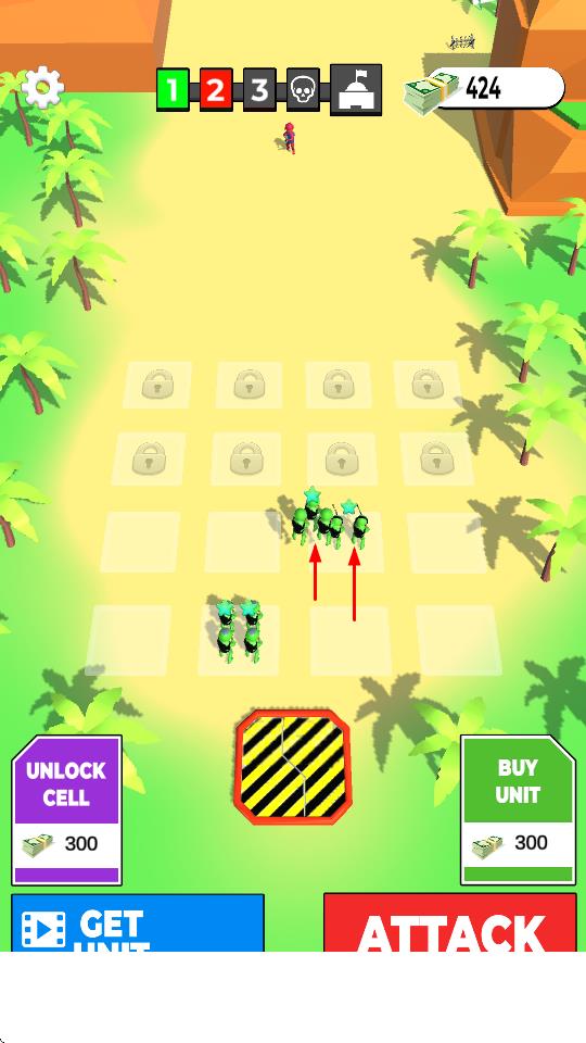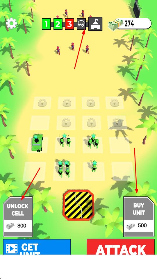 2、通过消耗金币,解锁格子、购买士兵,扩充己方阵容,升级基地,提升战斗续航与兵力储备。