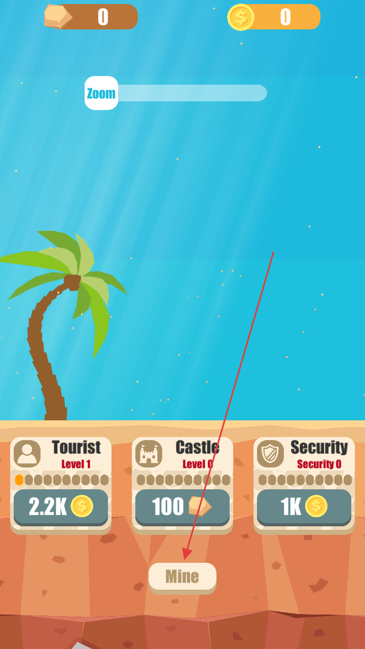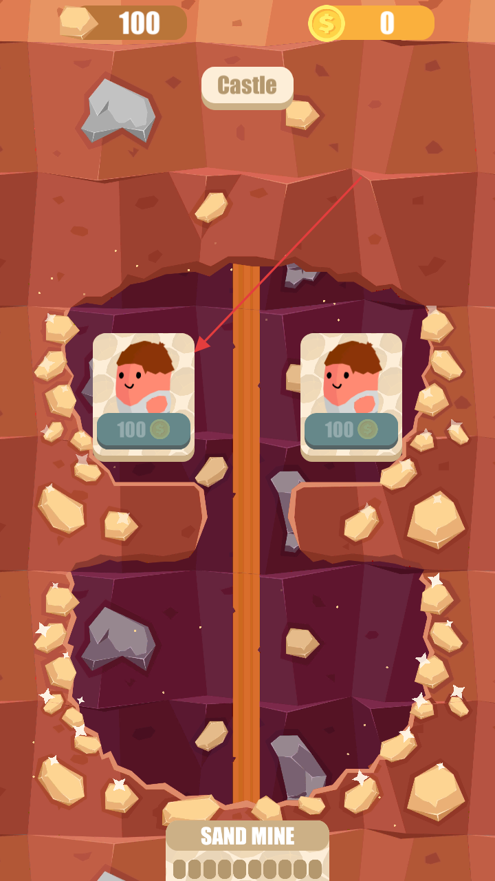 2、用金币升级“Tourist”“Castle”“Security”等模块,提升收益、解锁新矿山区域,或雇佣工人(如100金币的角色)自动挖掘。