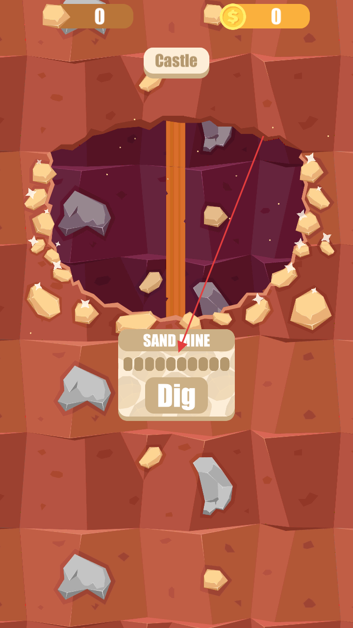 1、进入游戏,点击“Mine”进入矿山,选择“Dig”挖掘资源(如沙石),积累矿石、金币。