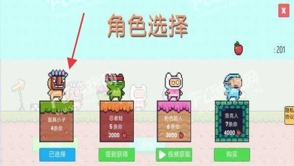 2、在角色选择界面,选定左侧标有【面具小子4条命】且显示【已选择】的角色。