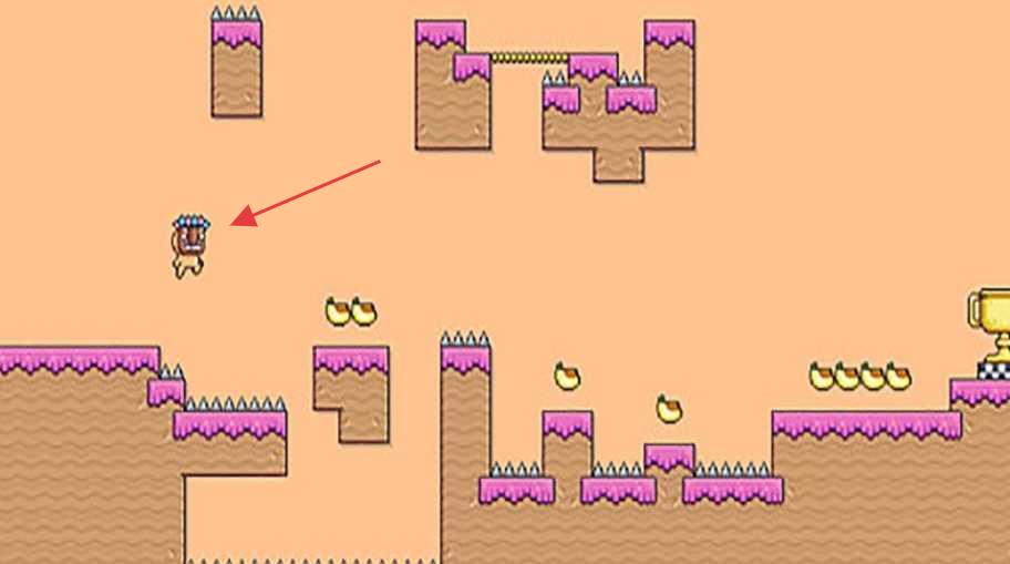 3、进入关卡后,操控面具小子在粉色地形中躲避尖刺,收集香蕉,向终点推进。