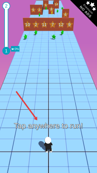 1、开局引导:进入关卡,按“Tap anywhere to run!”提示点击屏幕,操控角色起跑,熟悉操作。