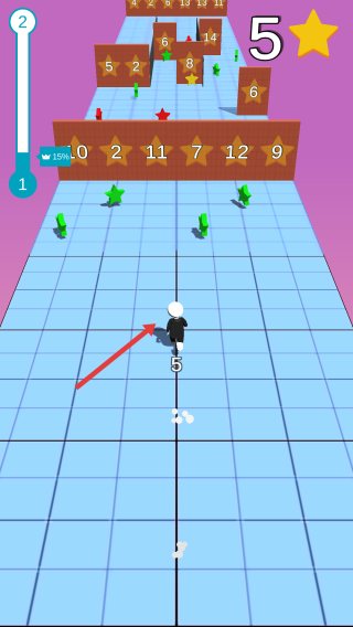 3、跑酷闯关:在3D跑道收集星星(绿色星星等),依据门的数字(如5),确保星星数量达标后穿过,持续推进关卡,挑战更高难度。