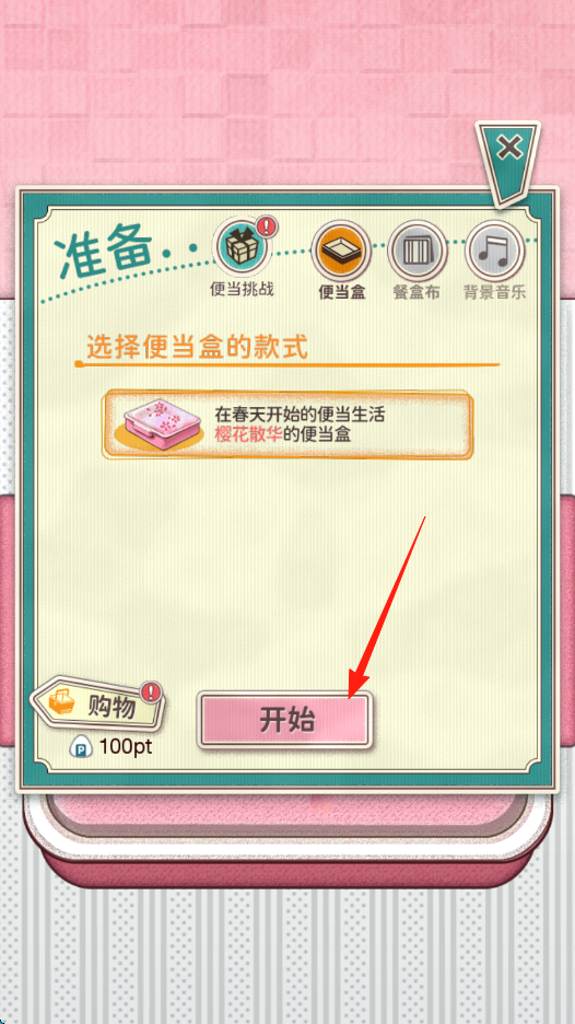 1、选便当盒款式,点击开始,按指引滑动配菜,让其移动、合体。