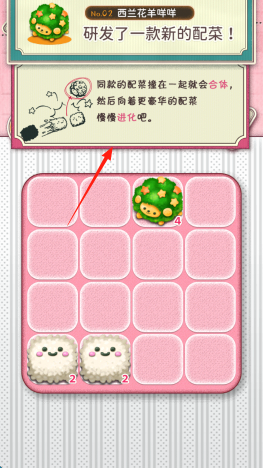 1、滑动手指合成配菜:让相同数字的配菜相撞,如2的配菜和2的配菜合在一起成为4的配菜,4的配菜和4的配菜合在一起成为8的配菜,以此类推进行合成。
