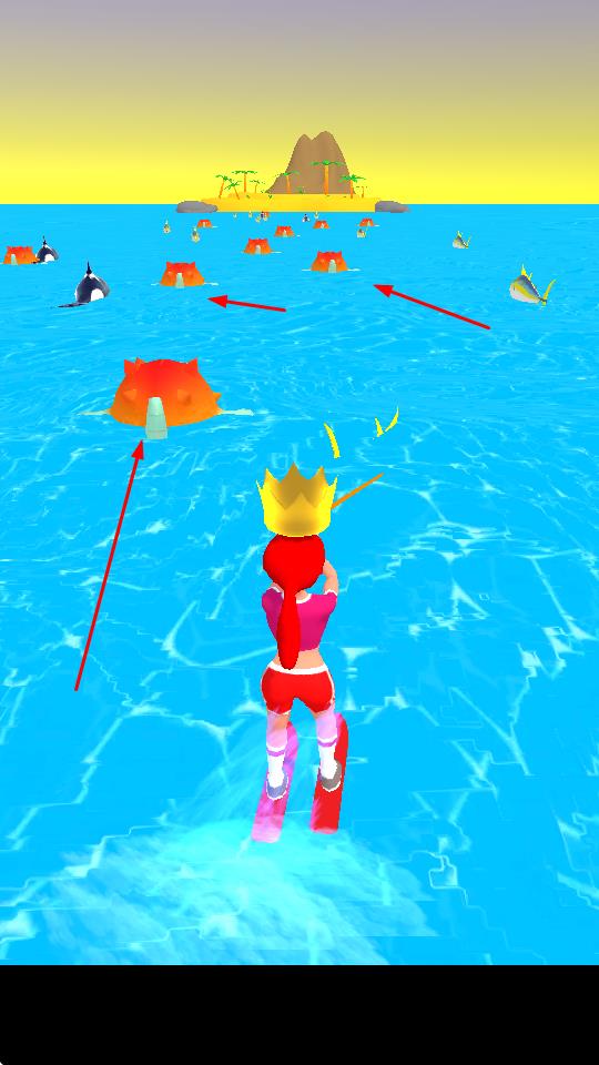 1、控制角色在水面滑行,通过左右移动,调整方向,躲避障碍,保持滑行路线。