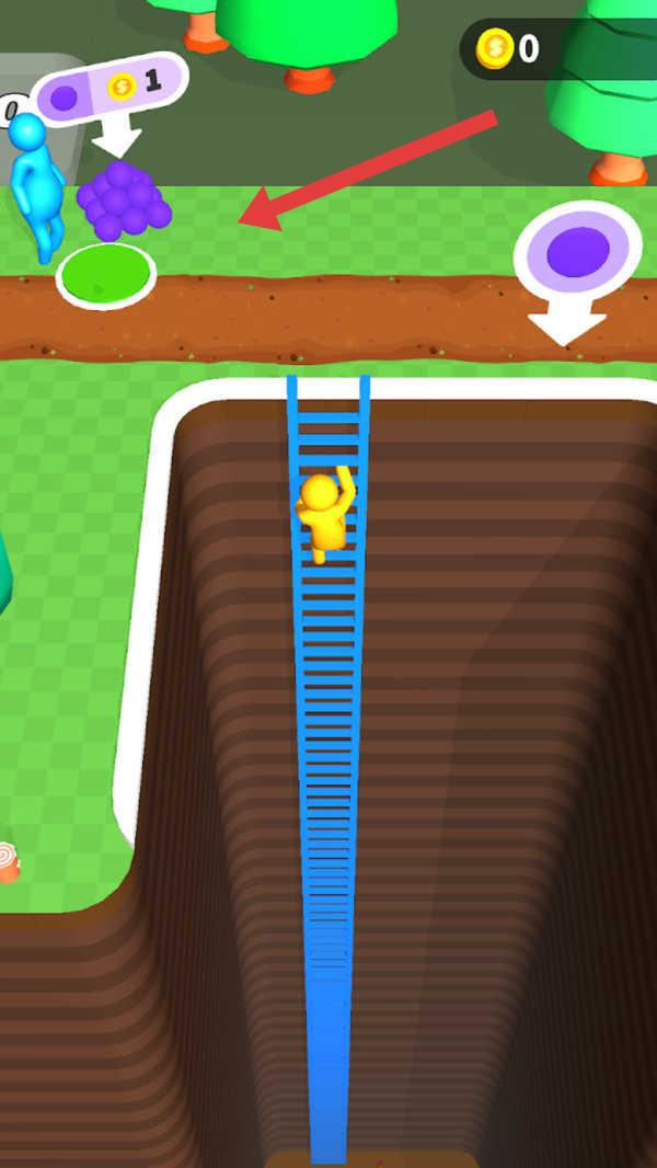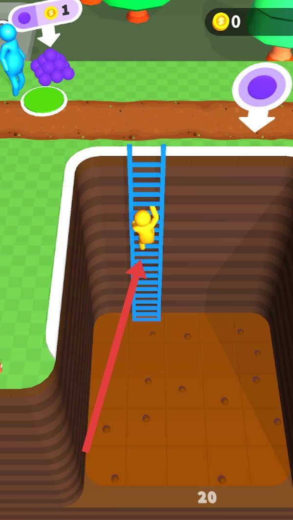 1、操控黄色角色沿蓝色梯子向上攀爬,朝地面移动,准备获取上方资源。